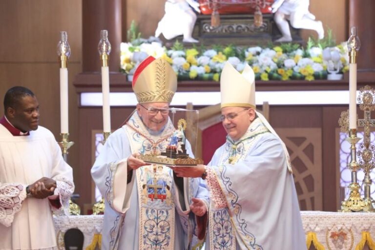 Les scènes de la Passion ornent les murs. Derrière l’autel fleuri, une statue de la Vierge Marie, drapée de bleu...